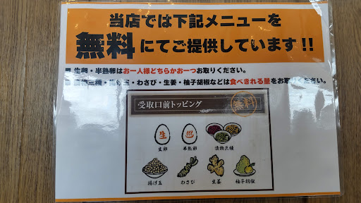 更にすごいのが、無料でトッピングも頂けるところ。生卵or半熟卵は1人1個までですが、漬物3種・揚げ玉・わさび・生姜・柚子胡椒も受取口に置いてあって自由に食べられます。小皿もたくさん置いてあるので安心です。