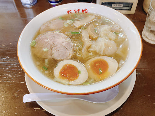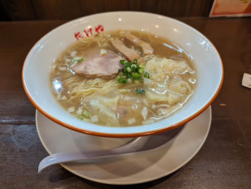 初めて来ました登米市No.1ラーメン店 麺は太麺も選べますが今回初訪なのでスタンダードに細麺。 注文から5分くらいで到着。早い。 スープは魚介系の醤油。あっさりだがしっかりとコクを感じるスープ少し濃いめの印象。これがブラフ。 細いストレート麺なのでスープとの絡みはどうかと思っていたが問題無し。スープの濃さを計算され尽くしたかのようなバランス。 次にトッピング。たけやラーメンは全乗せなので全て味わえるお得なラーメン。 メンマ…手作りメンマ味薄め エビワンタン…ぷりぷりのエビは食感のアクセントに チャーシュー…持ち上げると想像以上に厚い。味付けも薄め。柔らかいとはよく言うがトロトロ。ほんとトロトロ。 味玉…これはしっかりとした味付け。うまい。 ネギ…スープを飲み続けるとどうしても濃さを感じるが散らされたネギがいい仕事をする。食感アクセントも良き。