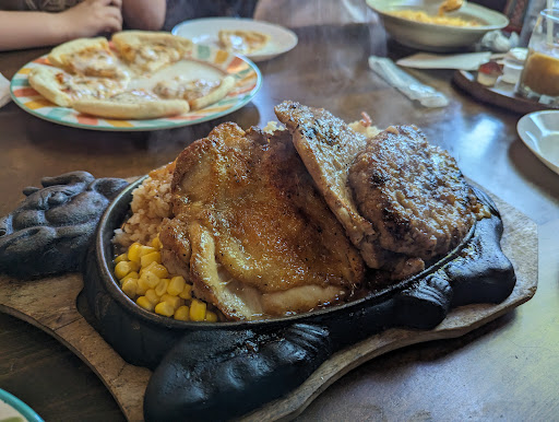 👦息子ちゃんが食べ盛りなんでマスターに大盛りサービスして頂きました。(ミックスドラキュラライス) ガーリック🍚にハンバーグ・ポーク🐷・チキン🐔がのった割とデカ盛り👌 色々食べたい❗迷っちゃうって👤人にはgood👍️メニューっす😃