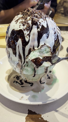 運ばれてきたかき氷は、鮮やかなミントグリーンにトロトロのホイップチョコがかかっていて、中々のサイズ。 運ばれてきた瞬間ワクワクが止まらず、見た目のインパクトがすごい。
