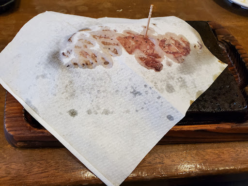 脂身多そうな写真から、サーロインステーキの食券購入して注文。 かなりの熱々鉄板に付け合わせ的なものはなく、シンプルにステーキのみで、好印象。 ただ、ほとんど脂身はなく残念ながら赤身肉オンリー。。