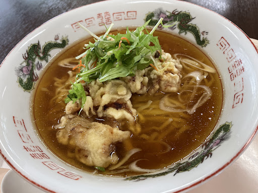 基本は食券制ですが、食券を買わずに注文口で内容を伝えてPayPayで支払うことができます。普段現金をほとんど持ち歩かないので、これは嬉しいですね。 鳥の天ぷらがのっているもみじラーメンをいただきました。施設柄ご年配のお客さんが多いからか、麺は柔らかくスープは薄味です。