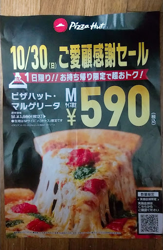 ピザハットの590円のやつに飛びついて行ったけど、広告詐欺だった。 やはりこの手のピザの広告って予想から全然違う詐欺のものしかない。 店員曰く、1人前でミニサイズのピザだそう。 ここの店舗ではなくピザハットが悪いのだけど、だったらそう書いてほしいし、1人前のミニサイズと書かず、Mサイズと書いてあるのも悪意がある。 こんなのが元は1980円な訳がない。ミニサイズに590円は妥当か少し高いくらいだろう。 しかも2時間待ちで、だったら通常のメニューのピザでいいやと思って頼んだら、こちらも2時間待ちだそうで、もうキャンセルして帰ってきました。 次からはこの手の企画には疑いの目を向けるようにし、もう二度と乗りません。