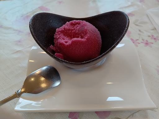 ■デザート ぶどうのシャーベット、フルーツとケーキセット ・シャーベットは、シャリシャリしていますが、アイスクリームのような密度で、ズッシリ。 ・フルーツとケーキプレートは、コースの〆に 相応しく、口の中をサッパリしてくれてコーヒーとの相性も抜群!! ※ネット予約時の店へのコメントを記入する欄があったので、30年の結婚記念日でお邪魔しますと記入したら、デザートプレートに、『Happy wedding 30th...