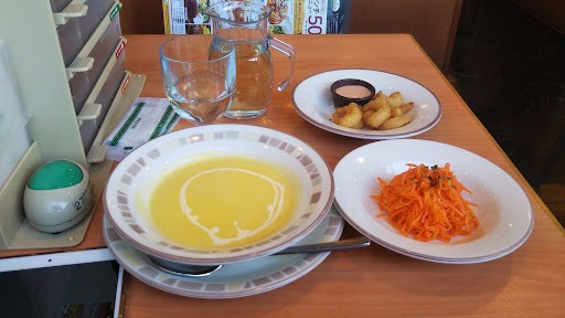 Read more富谷AEONの2階です。 イオンカードで支払い可なので助かります。 前は敷地内のガストで昼飲みしていましたが、ガストのワインが値上がりしてしまい(;つД`)、こちらに。 私の定番はデカンタの白200円、爽やかにんじんサラダ200円、ポップコーンシュリンプとハンバーグの盛り合わせ600円です。この盛り合わせは、ポップコーンシュリンプ、カリっとポテト、コーン、ハンバーグに目玉焼き、そしてチーズソースと、おつまみに必要なものがワンプレートに乗っていて、とてもお得。これでちょうど1000円。時々デザートにレモンシャーベットプラスしますが、それでもお得です。 ランチの時間は大変混みますので、10:00開店と同時に入って12:00に出るという、優雅な休日のサポートをしてく...