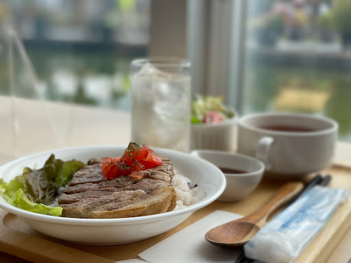 チューリップ四季彩館でのチューリップ球根祭り初日、ランチタイムの14時頃に初めて訪れました。お店は少しフードコートの用になっていて、外の景色が見えるガラス側のテーブルに着きました。(ちなみにお水や返却はセルフです。)お腹が空いていたので3種類のランチセットの中から気になったポークグリルランチ(1000円)を注文。お肉は南砺ポークと言う事で期待大です!グリルされたお肉の香りと柔らさは想像以上で他店では食べた事がない美味しさでした。(お肉に下味がついているのかも?) 正直なところチューリップ四季彩館でこんなに美味しいランチを食べれるとは思っていませんでした。🙏ランチ以外にもドリンクやデザートもあったので気兼ねなく...