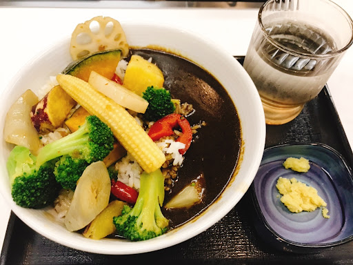 真っ黒なカレーに彩り豊かなな根菜類 見た目が綺麗‼︎ カレーの香りと相まって食欲を誘います。 カレーは中辛より少し辛い仕上がりかな⁈ おろし生姜がトッピングで付いて来るので 好みに合わせいただきました。