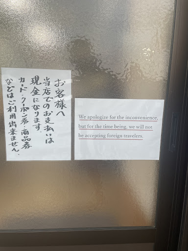 海外の方へ。店の張り紙に書いてました。 We apologize for the inconvenience, but for the time being, we will not be accepting foreign travelers.