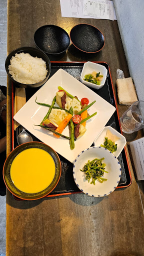 Read moreYou should arrive before 12 to make sure you get served. As soon as you arrive, write your name down on the list near the door. We had the fish menu, with locally grown vegetables. Everything was delicious and the service was friendly. One person of the staff spoke English. The atmosphere is very pleasant and the architecture is interesting. The interior is beautiful, with low tables and cushions to sit on. There is also the option to sit at the bar looking at the kitchen. The curry menu can be had outside, so you can skip the queue if you go for that option. We came with our 4 year old son and they served us some extra rice for him with a plastic plate for kids and kids’ cutlery. My son loved the rice, fish and green beans and...