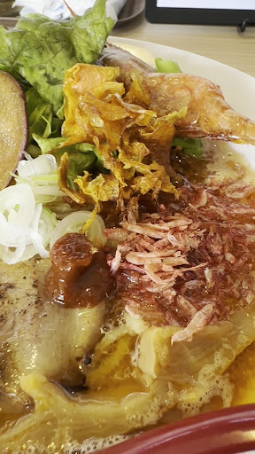 イメージでは、色とりどりの野菜が乗っていてヘルシーなあっさり系ラーメンかと思いきや。その透き通った醤油スープを頂いてみると。意外や意外に濃厚な鶏出汁です。出汁が濃いのは悪い事では無いのですが、ビジュアルと味が有わない事と。 先に具材について触れてしまいますが。素揚げして上に乗っているゴボウやさつまいもや人参かな?などの野菜が、油で素揚げされている為に濃厚な鶏出汁に油がプラスされてさらに濃厚地獄になってしまいます。 それでも薬味がピリリと効けば救いになるのですが、わずかに見える刻みネギはまるで存在感が無く効かず。 トドメに薄いチャーシューが1枚。野菜が前面に出ているので義務の様に乗ってはいますが。濃厚な鶏出汁に対して豚肩ロースの薄いチャーシューはありがたみが無いです。 最後になってしまいましたが、少し黒っぽい麺は小麦にこだわりが有る様でしたが。意外に押しの強いスープに圧倒されてしまいよく解らず。