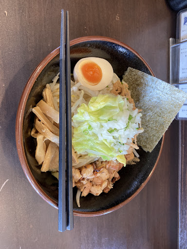 名前のわりにインパクトにかける油そば風。とても食べやすく、美味しいことは美味しいけれど、味に複雑味がない為、半分食べると飽きます。魚粉を使うとどうしても単調になってしまうので、もう少し動物性の脂で土台をしっかりさせる、もしくは辛味を足せる等、もう一工夫あると、もっとパンチのある病みつき油そばになるのかなぁ…。(あくまで私的ですが。)