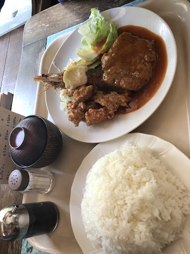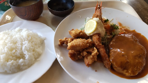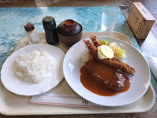 Read more平日の月曜日に、ランチ開始時刻の11時丁度に入店したら、後から次々にお客さんが来ました。 結構繁盛されてるようです。 ランチとは別に『Aセット』『Bセット』『Cセット』があります。 写真は『Cセット』です。 他の方の口コミで、エビフライが絶品と書いてあったので注文しました。 ハンバーグも美味しいのですが、確かにエビフライ美味しい😆 衣はサクサクなのに、中はぷりぷりで、自家製?のタルタルソースが合います。