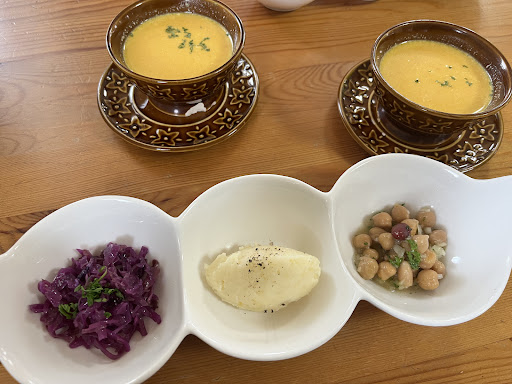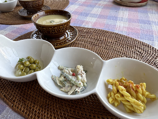 Read more友人が予約してくれ、平日の12時に伺いました。建物前の駐車場は1台分空いていましたが、車がSUVなのと後部座席に子どもが乗っているので出せない為第二駐車場に停めました。第二駐車場がわからなかったので、電話で聞いたら入り口まで出て来てくれて丁寧に教えてくださいました。 第二駐車場の方が広いのでそっちに停める方が安心です。 席は赤ちゃんがいるので2階にしてもらっていましたが、私たちの他に1組だけでした。靴を脱いで上がるタイプでテーブルでしたが、沢山赤ちゃん用の椅子もあり、ぐずったら床にも置けるしよかったです。 ご飯は日替わりにしました。前菜のサラダは少し味が濃くて塩っぱめな印象でしたが、スープは美味しかったです。 メインのお肉は野菜も沢山使われていてクリームソースとよく合って美味しかったです。 食後のデザートも付けましたが、チーズケーキは甘くてとても美味しかったです。 量的にはとても多い訳ではないですが、見た目も綺麗で美味しいのでとても満足できます。 子ども用の遊べるスペースにも玩具が沢山あったので、もう少し大きくなってからも食べに来れるなと思いました。 トイレにもおむつ替えスペースがあるの...