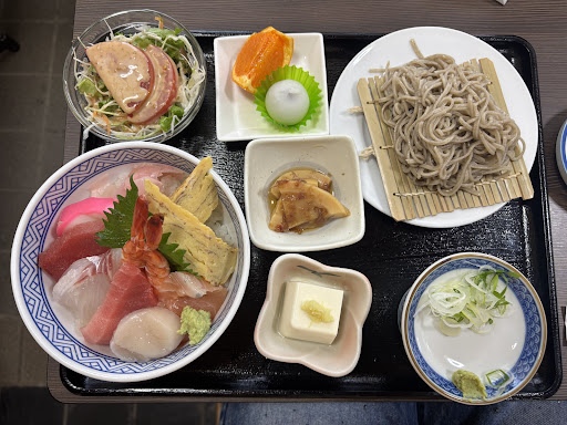 海鮮丼セットに冷たいお蕎麦をお願いしました。 海鮮丼、冷たいお蕎麦、サラダ🥗、筍の土佐煮、冷奴、デザートに甘いオレンジ🍊と小さな大福のセットです。