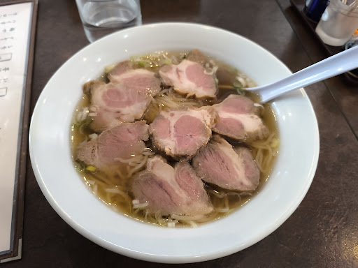 厚めのチャーシュー美味しい。 スープは澄んでいて優しい味。 店内を見回した感じ客層が年配の方が多い様なのでこのくらいなのかな。 コショウを一振するくらいがちょうど良かった。 値段は今時1000円いかないチャーシュー麺は嬉しい。 具材がチャーシューのみなのは少し寂しい。 100円プラスでメンマとか付けられたらいいのに。