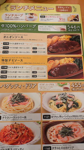 いくらファミレスでも「提供者のマナー」ぐらいは店員一人一人に徹底したほうが良いと思います。年末の忙しい時期に訪れたので、しかも高校生バイトみたいな若い店員さんが多かった事もあって個人的には「しょうがないのかな」とも思えなくもないのですが、”安かろう悪かろう”でも困るので、経緯は書きたいと思います。なかなか見られない非常識な対応でしたが、一人だけやたら頼んだメニューが遅く、やっと男性店員が持ってきたと思ったら「お待たせしました」の一言もなくテーブルに乗せ、それだけだったらまだ看過出来ましたが、戻る時に身内の飲みかけのスープ皿を「下げますか?」の一言も無く勝手に持っていってしまいました。それを近くを通った別の若い男性店員に伝えたところ、厨房に飛んで戻ったものの、おそらくどれがどれか分からなくなったんでしょうね。5分ほどしてスープ皿を持ってきたのですが、身内が飲んでいたのはトマト系の赤いスープだったのに、クリーム系のスープのを持ってきたんですね。これは駄目ですよ…忙しくても。しかも「申し訳ありません」などの一言もない。どこの誰が食べたかわからない残飯を持ってきて、しかもすみませんの一言もなしって、あなたがた店員さん一人一人、プライベートで訪れた店でそんな非常識な対応をされたらどう思いますか?笑って済ませられますか?なので、メガネの女性店員さんに帰り際「どうかと思う」と伝えました。それがお店に浸透することを願う次第です。”安いか...