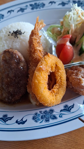 Read more駐車スペースが狭めなのがちょっと難点。 平日の11時15分頃に着いた時はまだお客さんはいない。 高齢の男性店員さん(オーナーの方?)が一番最初に「お食事でしょうか?」訊ねて来られる。そしてお冷とお絞り、メニュー表を持って来られます。ランチ利用の場合、食前と食後にジュースが付いてくるみたい。食後は分かるけど食前は初めて💨所謂「食前ジュース」ってやつ(^^; 私はグァバジュースに。濃厚で美味しい。その後すぐにスープが持って来られて「熱いのでお気をつけください」と仰有られました。本当に熱い❗ある程度冷ましてからでも良いぐらい。卵スープで、これも美味しかった。 注文はネーミングが面白い「大人様ランチ」を。到着して何とも美味しそう。名前の通りお子様ランチを成人サイズにした感じ。ハンバーグ、エビフライ等、子供が好きそうなおかずばかり(笑) 勿論、味は美味しかったです👍ハンバーグは普通かな。イカリングやエビフライ、小さめの唐揚げは揚げたてサクサク✴️小鉢のフルーツの味は何となく缶詰めのヤツっぽい。 食後はアイスコーヒー、ミニ和スイーツにしました。後から思ったんだけど、コーヒーを注文したのならミニパフェにしとけば良かったかな~と後悔(苦笑) それでもミニ和スイーツはとても美味しかった✨️