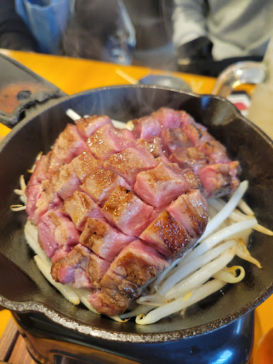 「焼き鳥パーラーコジマ商店」さん 正式名は忘れましたが、マンゴーカット厚切り牛たん丼は厚切りの牛たんが鉄板のもやしの上でジュージューとレアで運ばれ、お好みの焼き加減で食べられます。