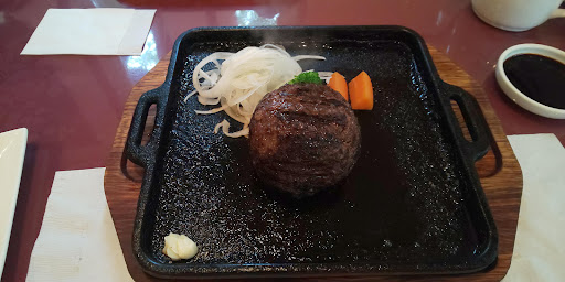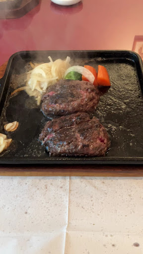 口コミ見て店汚くて店主さん怖いのかと身構えてたけど全然そんなことはなかった。新装開店の花があっても違和感ないくらいピカピカだし、店員さん、少なくとも笑顔の素敵なおばさまとかっちょいいにーちゃんはすごく丁寧に対応してくれた。店主さんもご馳走さまと言ったら嬉しそうにしてくれたように見えた。 200g炭焼きハンバーグとオニオングラタンスープを注文 まずサラダ、ドレッシングがすりおろし野菜たっぷりで美味しい!キャベツが炒めてあるのも素敵。生で作り置きするとカピカピになっちゃんもんね。炒め具合も絶妙で、キャベツの甘さを引き出しつつもシャキシャキ食感がちゃんとある。レタスもみずみずしくてハンバーグへの期待を高めてくれる。 それからオニオングラタンスープの登場。握りこぶしくらいのカップを覆い尽くすチーズに思わずよだれが。スプーンを入れるとはずみでスープがこぼれてしまう。もったいない!中にはトロトロになったフランスパンと、驚くべきことに飴色玉ねぎがぎっしり。お分かりいただけるだろうか?握りこぶし大のカップにみちみちの飴色たまねぎ、生の時はいったい何個分だったのか、何時間かけて炒めたのか……。とろけるチーズの質も良い。やっすいやつを適当に加熱すると味が抜けてぐにゅぐにゅしたゴムの様になってしまうが、このチーズは奥深い風味をその内に留めたまま無限に伸びる。ほんとに濃厚なこのスープ、他の料理の隠し味にすら使えそうなポテンシャルを感じる。 そしてお待ちかねハンバーグ!見た目はテニスボール大のこんがり焼けた球体。鉄板ジュワジュワ。初めて見る物体に少し戸惑う。そこで店員さんから、ナプキンを胸元までお上げくださいの指示。そんなウォータースライダーみたいな注意がいるのか?と疑問に思っていると、ハンバーグをぶった斬り、ソースを注いでくれた。噴水の如く飛び散る肉汁に驚愕。これはエンターテイメントやでぇ! 中は想定よりもかなり生っぽく見える。ひき肉ではなく薄切り肉を纏めている。まずは焼けている表面をかじると、芯のある炭火の風味、カリカリの食感、じゅわじゅわの肉汁にぶちのめされる。これはうまい!!付け合わせのソースもよく炒めた玉ねぎの甘み、コク、ほろ苦さと酸味のバランスが最高で、ステーキの味を引き立てる。 あまりの美味に警戒心も雲散霧消、真っ赤なお肉も食べてみた。ああ!これは狩に貢献した選ばれし狩人のみが許される味!!野生の本能はこれをずっと求めてきてたんだ!!おそらく完全に生なのではなく、あたかもレアステーキの中心部の様な状態なのだろう。生肉独特の鉄臭さは全く無く、そのジューシーさを完全に残したまま、加熱された豊かな旨味も勝ち取ったのだ。 夢中で食べた。表面の炭の香り、食感と中身のジューシーさ、荒々しい旨味が織り混ざり、これを書いてる今でさえ思い出しよだれが止まらないほどの美味が脳を揺さぶった。 付け合わせはたっぷりの玉ねぎと人参、ブロッコリー。鉄板に触れていた部分はこんがりと焼け、素晴らしいアクセントになっていた。 ここで悲劇が一つ。二等分された片割れを夢中で貪っていたら、もう片方に完全に火が通ってしまった。皆さんは食べる時、もう片方を付け合わせの上にでも避難させてあげましょう。 食べ終わった時、最初に用意してもらった薬味を使い忘れていたのに気がついた。ハンバーグが美味しすぎるのが悪いのだ。ニンニク、わさび、柚子胡椒。...