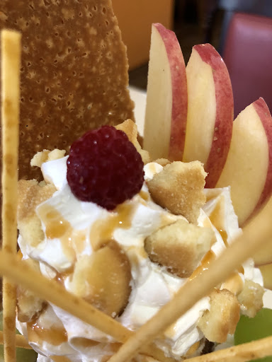 R7年5月27日 再訪。今度はパフェのみ食べようと思いお邪魔しました。 可愛らしい声の女性スタッフさんが「お好きな席へどうぞ」と案内。 メニュー表は大きいうえにパフェの種類が豊富。迷ったけど、一番ボリュームがありそうなキャラメルカスタードパイの通常サイズ、それとアイスコーヒーのブラックを注文。 まず最初は皿とスプーンのみ、パフェはその後。別々に持って来られる。 パフェは甘くて美味しい✴️刺さっているパイのクッキーが香ばしいです☀️ パフェそのものが甘いのでブラックコーヒーで時々抑えながら頂きました。