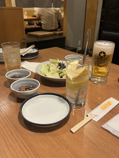 Read more雨上がりの帰宅路で強い日差しとじめっとした生温い風の中、30分歩いたご褒美を求めて、ふらっとたどり着きました。入口から数メートルの長いカウンターの一番手前を案内され、?っと思ったけど、仕事帰りのサラリーマン、仕方のないポジションかなっと納得( ´∀`) 一応でゆっくりとメニューを眺め、はなから確定していた生ビール、大ジョッキ!更にメガジョッキ〰️ー!!! 心踊ります🎶 お通しは、鶏肉とキャベツの南蛮漬け風?と病み付きキャベツの塩昆布添え、さっぱり夏仕様でありがたい。 知らずに注文した、鶏ハラミ軟骨ぽん酢和え。コリコリのヤゲン軟骨の周りに纏われた弾力のあるハラミをぽん酢とたっぷりのゆず胡椒でピリッと、ビールに合います! 気がつけば酢の物ばかりで………。 メガジョッキという気持ちの余裕で帰ってグイグイと生中ペースで消えていく( ^ω^ ) アテも無くなってきたタイミングでおまかせ焼き鳥7本盛りが登場。特に盛り合わせの説明もなく、何となく見覚えのある、食べ覚えのある味かします。塩気の効いたもの、甘めの柑橘風味のあるもの、肝や皮がせせりなど……。暖かいうちに頂こうと、一切れずつ横並びに食べ進める若干の違和感。 そろそろ別のお酒が欲しくなり、日本酒を冷やで頂きます。繁桝が何種類かメニューにあり、やや辛口で焼き鳥に合います🎵 最後にもう一杯と島美人をロックで頂きました。以前に鹿児島の長島に行ったことを思い出しながら美味しくいただきました。 焼き鳥の後追いで出てきた鶏肝ピリ辛南蛮、こちらも焼酎に合いました(...