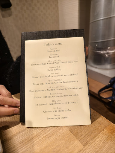 Read moreWe made a reservation well in advance for FukFuk, a yakiniku gem in Tottori, and pre-ordered their signature FukuFuku course. The set meal was an absolute feast, packed with a variety of dishes: juicy steak, wagyu sushi, pork, chicken, beef, vegetables, soup, rice, and even dessert. For the price, it’s an incredible steal—portion and quality far exceeded expectations. The restaurant uses Manyo beef, which boasts perfectly balanced marbling. Each bite melts in your mouth without feeling overly greasy, striking just the right note. The owner’s fluent English made the experience even better, as he patiently explained how to pair the meats with different sauces, elevating the meal. His warmth and attention to detail kept the entire dining process delightful. We enjoyed it so much that we added an order of beef tongue and two portions of kalbi to keep the feast going. This place is a must-visit, and we’re already looking forward to our next trip back. Deliciousness Rating: ★★★★★ (5/5) Service Attitude: ★★★★☆ (4/5) Value for Money: ★★★★★ (5/5) Likelihood of...