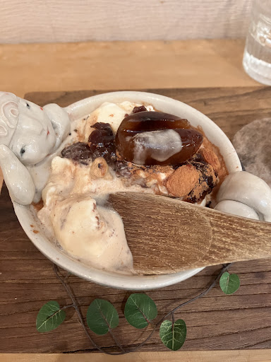 気になっていた珈琲ぜんざい円。たっぷりの豆腐アイスにナッツやドライフルーツがまぶされている器。器の上にある珈琲豆の形をした氷に、隣の熱めの珈琲を掛けて溶かして食べるスタイル。かなりゴロゴロとナッツが入ってるので食べごたえがあるデザートです。甘さは控えめ。味は想像を超えません。珈琲とソフトクリーム。
