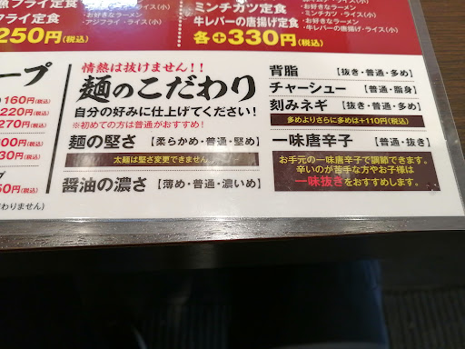 Read moreã©ãŒã¡ã³ãé£ã¹ãŸããã麺ã®ç¡¬ãããã®ã®éãªã©éžã¹ãŸããã¡ãã¥ãŒã§ã¯ãåããŠã®äººã«ã¯æ®éãå§ããŠãããŸãããã麺ã¯ç¡¬ãã奜ããªã®ã§ãããéžã³ãŸãããèèã¯ãŠãªãããããŸãããåŸããèžçŒãã«ãªãäœè³ªãªã®ã§è¿·ã£ãŠãããšãã¡ãã¥ãŒã«ã¯æžããŠãªããå°ãªãããéžã¹ããšæ³šæåãã®ãå§ããã«èšãããããããŸãããåŸã¯æ®éã«ããŠãæåŸ ã©ããã®å³ã«æºè¶³ããŸããããäžå³åèŸåãæšæºãªã®ãèŠéããŠããŸãããèŠæãªäººã¯æããŠãããŸããããã¡ãã¥ãŒãªåçãåèã«ã奜ã¿ã®æ³šæãéžãã§è¡ããŸãããã åææ¥ã®æŒã§ãããã12æ5ååã ãšãé§è»æãããåããããåžã«ããã座ãã5åã»ã©ã§ã©ãŒã¡ã³ã«ããã€ããŸããã ææç察çãšããŠã«ãŠã³ã¿ãŒã«ããŒãã£ã·ã§ã³ããããŸããã¹ã¿ã³ãã«ã¯ããŠããã®ã§ãåããŸããã«ãŠã³ã¿ãŒã®å·Šç«¯ã¯ã¬ãžã®é£ãªã®ã§ãèã«ãªãããããéšãããã§ãã 以åã®åçãèŠãŠ600åå°ã§é£ã¹ãããšæã£ãŠè¡ããŸããã700åïŒçšèŸŒïŒã§ãã³ã¹ãããã©ãŒãã³ã¹ã¯æ®é...