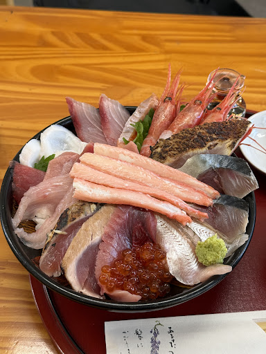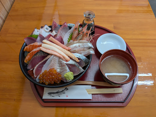 Cozy, modest setting for kaisendon, or rice bowls with sliced raw seafood, plus sides.
