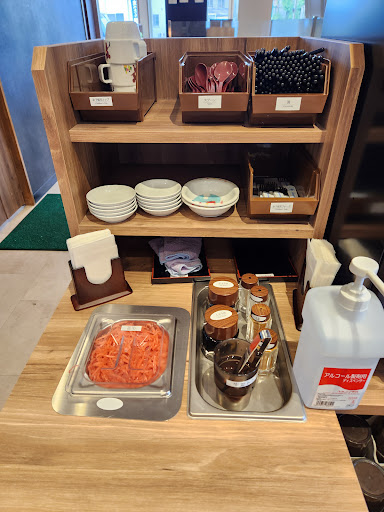 R7.2.12 PM0:50頃確認。 前回来店から3年振りとなりましたが、タイムパフォーマンスの悪い改装がされてますね。 店内はL字型かつ展示パネルで視界不良なうえ、レジ担当がいちいち持ち場を離れて店内を見回らないと席の空き状況が把握出来ない仕様。 しかもレジがオンリーワンなのでテイクアウトとイートインの区別が出来ず、客がオーダーできるようになるまで待ちぼうけ。 箸、スプーン、水は1箇所のみでレジと返却口とバッティングする位置にあるのでさながら事故渋滞。 店員はレジとバックヤードにしか基本的に配置がないため、イートイン席の清潔保持責任は客に丸投げ。 この店内設計及びオペレーション考えた奴はシンプルに無能。