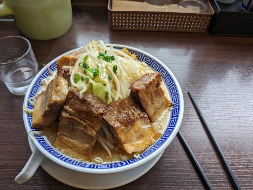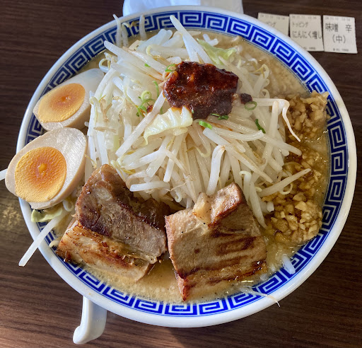Read more近くにある某ラーメン店と比べると言うほど癖が強いわけではない。醤油を頼んだけどスープも割と軽い。 売りとしてはチャーシューと野菜(ほぼもやし)だろうか。野菜マシだともやし一袋分くらいありそう。チャーシューは厚さ一センチくらい?一枚名刺サイズかもう一回り小さい程度。歯応えはあるけど噛めば肉の繊維がほぐれる感じ。 ニンニク入れます?って感じの事を聞かれたけど、ほとんど感じられない。すりおろしそのままじゃないから匂いとかもほとんど無い。 総評すると「普通のラーメンよりはちょっと癖があるスープに大量のもやしとデカイチャーシューを乗せた」って感じかな。女性サイズがあるんで女性でも食べきれるサイズっぽい。食べたい人は大盛豚ダブル野菜増しとか。ただ、こういう田舎ではちょっと厳しい価格設定が今後ネ...