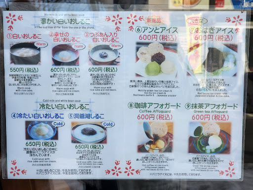 Read moreHad the Oshiruko (a Warm sweet white rice porridge) with a rice wafer at this corner cafe - picture on menu shows a decent size bowl but I was quite shocked when they served it to me in a small coffee mug. When I asked serving staff if this was what I ordered she nodded saying yes (later I read a disclaimer on the bottom of the menu advising customers that their order may not look the same as depicted on the photos). Anyway I was quite disappointed as the porridge felt watered down with a few small rice balls but nice to have something warm on a...