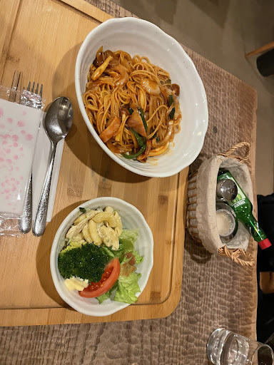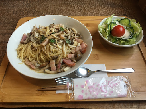 Read moreVery charming place with a small gallery displaying woodwork crafts. Black tea and meat sauce pasta were good and the owner even gave us a bowl of strawberries...