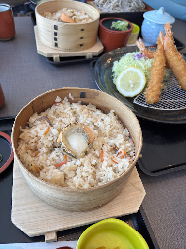 A Japanese restaurant that offered breathtaking views of Lake Toya through its floor-to-ceiling windows. Located on the second floor, this establishment provided a serene atmosphere for enjoying a delicious meal. I ordered a tempura soba and a steamed sticky rice with scallops.