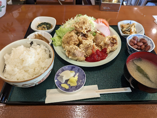 唐揚げ定食はこれでもかとたっぷりの唐揚げ(唐揚げ6個以上はあったような?)で、夫はかなりお腹いっぱいになったと言っていました。少なめで!と言ったら多分対応していただけるので少食の方は是非注文時に進言してください。ご飯はおかわりさせていただけるようなのでたくさん食べたい人にもありがたいお店です。 食後のサービスにコーヒーゼリーホイップ乗せを出してくださりました。