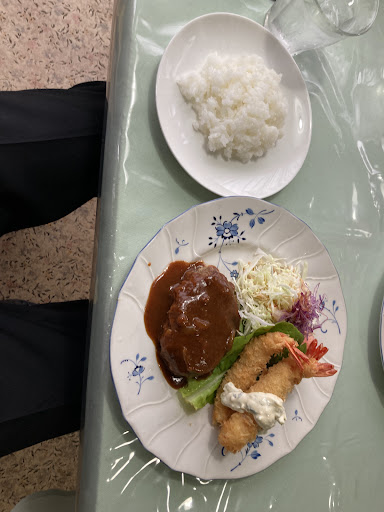 運ばれてきたのはなんと!デカイアツアツプレートにオンしたチーズハンバーグ!でかい! これは小学生なら跳び跳ねて喜ぶ逸品ですね、間違いない。 ぼくも踊り出したい気持ちを抑えながらナイフを入れました! 後がけのソースがまたいいですね!カレーとデミグラスの中間のような感じで、ライスが進みますよ! AセットBセットは食後にコーヒーがつく仕様。 友人のオムライスも超美味そうでした!