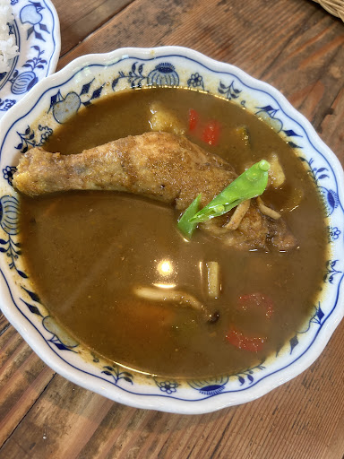 ルーは、程よい辛さで、うま辛い味わい。 具は、名前のとおり、チキンと卵と野菜で、盛りだくさん。 チキンは、骨付きの鶏の足がまるごと入っている。 カレーにまみれたチキンを、骨から肉を取って食べるのは、やや面倒ではあるが、 肉は結構柔らかく、フォークとスプーンで普通に取れる。食べごたえはそれなりにある。 卵は、白身はそれなりに固まっていて、 黄身はとろとろで、おいしい。 野菜は、ニンジン、じゃがいも、いんげん、しめじ、パプリカが入っている。 いずれも、そこそこのサイズで、ルーと一緒に食べると、おいしい。