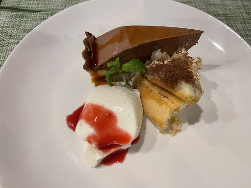デザートは チョコレートと洋梨のタルトに パンナコッタ、ティラミスの 見た目も楽しい組み合わせ