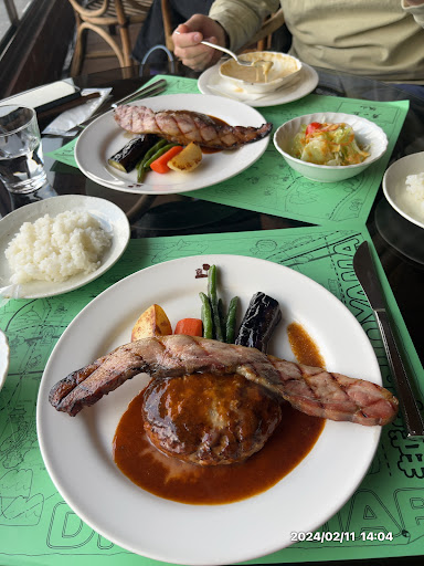 Read more初めて訪れるお店だったので、14時前に架電にて『お食事(一般的なランチタイムを過ぎていたので)できますか?』と聞きましたら、男性スタッフの方が丁寧に対応してくれました。 当方アラ還の大阪のおばちゃん、富山市内でお世話になってる息子の様子を見にきてGoogleマップで山小屋風の雰囲気に惹かれて、夜勤明けの息子に連れられての富山初の外食。 自家製ベーコンとハンバーグのコンビランチをいただきました。自家製ベーコンの大きさとあまりの美味しさにビックリ‼️付け合わせのお野菜も素材が良くて美味しい。 ハンバーグはもちろんそれらに負けない肉汁たっぷりの肉々しいハンバーグ。 お口の中でいっぱいの幸せを感じる事ができました。夜勤明けの息子の仮眠を待って我慢してた空腹を満たすばかりか心まで満たされました。 そして余裕ができて、まわりのお客さんを見渡すと珈琲だけを飲みに来られている方達の多いこと。(禁煙なのに…) 食後に手作りケーキセット(チョコケーキは珈琲が飲めない甘党息子に)を頼みました。 その珈琲の美味しさは上手く表現できないぐらいの酸味と苦味のバランスの良い雑味のない何処でも味わった事のない、私史上(61年生きて来て)1、2の美味しい珈琲でした。感動で涙が出そうになったぐらい…。 大学生時代にゼミの先生に連れられて行った昭和の良き時代の純喫茶のカウンターで飲んだ珈琲。当時はまわりのお客さんは皆んな喫煙されていたので美味しい珈琲も味が半減。それでも昔ながらの淹れ方の珈琲は美味しかった(^^)v …なんて遠い昔に思いを馳せながらゆっくり味わいました。 山道を上がってわかりにくい場所にありますが、混み合っていた訳がわかりました。 ぜひ窓から見える素晴らしい景色を見ながら美味しい珈琲を飲みに行って下さいませ。