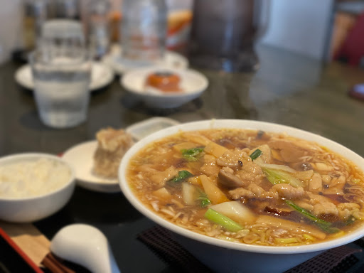 平日、土曜日はお得なランチメニューが4種類あり、その中から五目ラーメン定食の醤油(塩、醤油、坦々麺からセレクト出来ます。)1045円を注文しました! しばらく待つと定食が運ばれて来ました。定食の中身は五目ラーメン、ご飯、点心(今回は焼売)、お新香とボリュームタップリ! メインの五目ラーメンは豚、鶏、海老、イカ、うずら、キクラゲ、しめじ、椎茸、マッシュルーム、白菜、ネギ、ほうれん草?など具材が贅沢なくらい入っています。 熱々なラーメンを食べると寒さも忘れ体がポカポカ温かくなって元気になれました! 点心の焼売も普通サイズの2、3個分ぐらいの大きさ。具材の餡にはたくさんの食材が入ってます。ご飯も無料でおかわり出来ます。