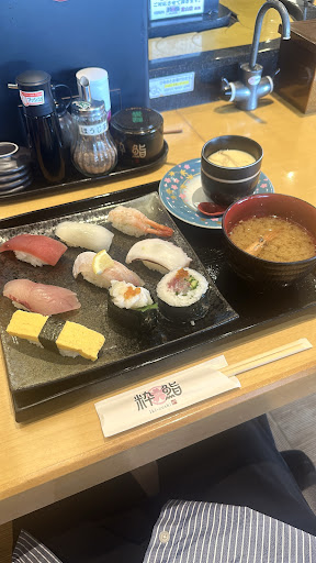 各席にあるタブレットで注文するシステムで、ランチメニューから以下をいただきました。 ◎満腹ランチ(税込1,342円) 満腹ランチは、にぎり10貫、押し寿司、巻物、いなり寿司、と味噌汁、茶碗蒸しがついた数量限定のランチです。 ちゃんと目の前で職人さんが握ってくれて、この価格はリーズナブルですね。
