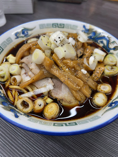 戦後の復興期、復興作業にあたっていた現場の人の塩分補給と白飯と共に食べることでおなかを満たすために塩辛いのが特徴だということは事前学習済。 他の富山ブラックラーメンのお店に比べてもこちらはかなり塩辛いということも承知。 とはいえ……と舐めてかかって、ライス一緒じゃ食べきれないかも……と、2人でうかがって中華そば並+ライスと中華そば並単品を注文し、ライスはシェアしようということに。 結果、ライス追加しました、ラーメンだけじゃ無理(笑) 最初「あれ?レンゲついてこないんだね」なんて言っていたけど、ひとくち食べて納得、そりゃそうだ。 スープはほぼ醤油、麺はスープを吸ってか焼きそばレベルの茶色、ガツンとくる塩分。 事前に把握はしていたけれど、なによりメンマがすごかった。塩抜きせずに醤油に浸けたのかってくらいの塩分。塩より塩辛い。すごい。 ライスの分おなかもいっぱいだし、どうにか完食したけれど、身体へのダメージがすごかった。 普段ごはんの後に眠くなりがちな連れが覚醒していた。 食べた後ずっとなにか身体がそわそわしていたのも印象的。