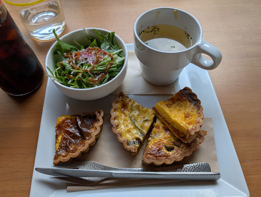まずカウンターにて注文、代金は前払い制になっています。お水は、フロアの数カ所にウォーターピッチャーとグラスがあるのでセルフで。用意されてるグラスは、敷地内にあるガラス工房で手作りされたもののようで、いろんなグラスがあって選ぶのが大変でしたが、それもまた楽しかったです。 4種類のキッシュを選べる『キッシュランチ』を食べてみました。スープ、サラダ、ドリンク付きです。小ぶりなキッシュでしたが、結構おなががふくれました。(男性だと物足りないと思われます💧)
