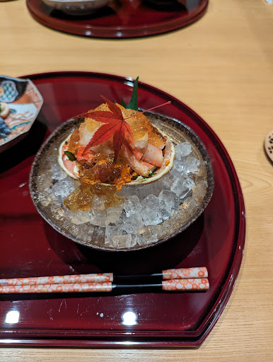 Area-sourced seafood dishes offered with sake, wine & whiskey in a serene setting.