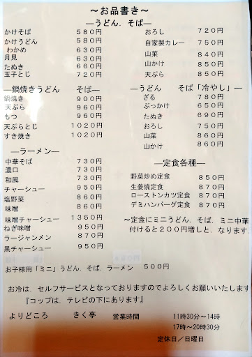 20241219 2ヶ月余りぶりの訪問 最近、ランチのセレクトが偏っていたので、丼物を食べに伺いました ここは、カツ丼がシンプルに美味しいです 20241004 迷った末、駐車場が空いていたので入店、ミニチャーハン+ラーメンセット頂きました。 ラーメンは昔ながらの醤油ラーメン、麺がツルツルで美味しかった。 20240809 久々の訪問、カツ丼セット+冷やしソバ大盛(ぶっかけソバ)1,170円がっつりいただきました。 20240613 今日は新規開拓で行った店が休業日、出鼻くじかれきく亭さんへ カツ丼セット冷ソバ大盛りをチョイス。冷そばが予想に反してぶっかけソバで山菜&かまぼこトッピング。 カツ丼は安定の旨さ、冷ソバも腰があってつゆも美味かった。