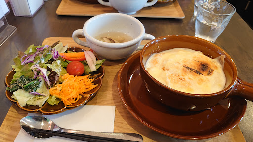 喫茶店で検索、行ってみようということに。5席と小スペース。15時、軽食のつもりがエビドリア(¥1300)を頼み、ん!+¥200でコーヒーor紅茶。プラス(¥1500)で頼みました。フレンドリーなママさんで食べたいけどお話しが楽しい(笑)。 やっと食べ終えドリンク。デザートも付き閉店間際でもありサービス。。。。コーヒーのおかわり(継ぎに来た👀) もう、お腹いっぱい大満足!!! 農作業時期になったらお休み終わると再開するそうです。...