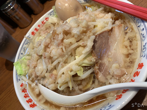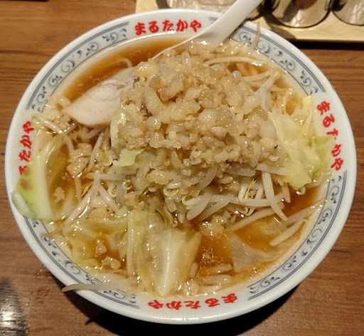 Read moreまるたかやの背脂揚げが入った豚骨醤油ラーメンが大好きで、無性に食べたくなったので来店しました。 着席後、まる二郎ラーメンなるメニューを発見。二郎系も好きなので、掛け算で絶対美味しいじゃん、と思って注文しました。(背脂マシ+味玉トッピングで) 盛り付けはジャンキーな感じで美味しそう!と思いましたが、よくみると透明な脂がスープの上に一層(1cm厚くらい?)背脂が溶けているのかな?と食べ進めてみると無味。麺や野菜も、二郎系に倣ってワシワシと混ぜてみるものののスープの味が絡み付いてこない…🤔恐らく脂がコーティングになってしまっている?? 初注文なのに背脂を増したのがよくなかったかもしれません。スープの味や麺は恐らくいつものまるたかやラーメンっぽい感じなので、必死に掬い上げて楽しみました笑 味玉も美味しかったです。 なので、もう少し透明な脂をなんとかできたらなぁ…と思いました! 次はノーマルなラーメ...