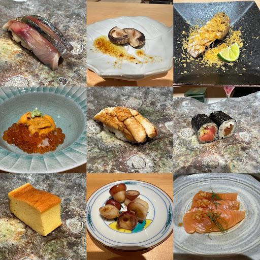 ・まぐろ赤身 ・さより ・とり貝 ・あおりいか すだちと塩 ・のどぐろあぶり ・車鯛の昆布じめ ・真鯛 ・中トロ ・しめ鯖 ・いくらとうに ・穴子 ・トロ鉄火 ・干瓢巻き ・卵焼き