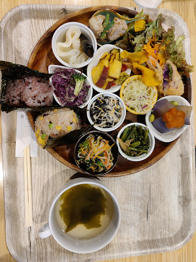 Read moreランチタイムは11:00~。 この時間帯は、一時間までしか滞在できないことになっているそうなので、まったりとした時間は過ごせなさそうです。 とにかく、繁盛しているので、できれば予約しての来店をオススメします。 人気のメニューは、雑穀米のおにぎりが2つついてるランチセット。これは、限定20食となっていますが、私がお邪魔した日は、オープン一時間で18食程のオーダーがありました。 ちなみに私もこのセットをいただきました(^.^) 雑穀米おにぎりのランチセットは、ワンプレートに数種類のお惣菜がのっていて、彩りが良かったです。ただ、味は、凄く濃いものと、ぜんぜん味のしないもの(味付けし忘れ?それとも素材の味を楽しむ為?)があり、何だか複雑でした。 150円プラスしてスイーツもつけてみました。この日のスイーツは紫芋とさつまいものタルト。特に手作りではなさそうでした。甘々のタルトでした。