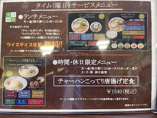 Read moreかれこれ25年以上天一を愛し、京都、愛知、東京、仙台、新潟、群馬、金沢、富山で天下一品を食して来ました 新潟が「天一無し県」になって久しく、最近は仕事で富山を訪れる機会が増えたので、富山唯一のこちらのお店を利用させて頂いています まずお店の雰囲気が良いです 主に来店するのはランチの時間帯ですが、どの店員さんも感じが良く丁寧です 味も文句ありません 何より特筆は、「平日限定ランチ」です! 私は「トッピングランチ」ばかり注文しますが、ラーメン単品940円に50円を足すだけで、トッピング1つとライス(大中小選べます)が付いてくるお得感! 私は決まってネギトッピングとライス大をお願いしています ランチや定食、セットメニューはお店によって異なりますが、富山掛尾店さんのランチはかなりお得な方に入るのではないでしょ...